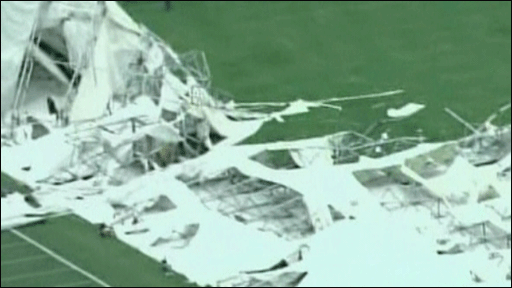 Uma das câmeras filmou o momento em que os jogadores correram para se proteger quando o teto da estrutura desabou.