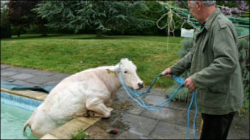 Uma vaca não resistiu à piscina de um britânico em Milton Keynes, nos arredores de Londres, e entrou para um mergulho.