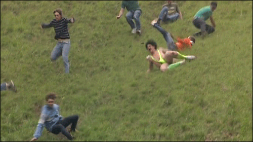 Os competidores, que vêm de várias partes do mundo, têm que descer uma ladeira íngreme com 200 metros de comprimento, atrás de um queijo redondo que pesa em torno de 3,5 kg.