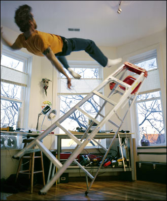 Kerry Skarbakka, de 38 anos, reúne uma coleção de fotos que incluem o salto de uma ponte, a queda do alto de um prédio em plena área urbana, um mergulho do alto de uma escada e até um escorregão acrobático dentro de uma banheira em que ele aparece nu, de perfil.