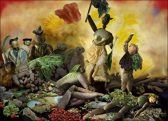 A artista chinesa Ju Duoqi gosta de brincar com comida. Tanto que ela recriou telas de artistas famosos posicionando com cuidado batatas, gengibre, couve, tofu, cebolas e pepinos.