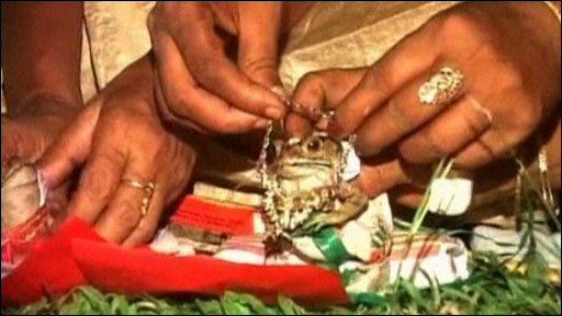 Indianos de um vilarejo no norte do país realizaram um casamento de sapos.