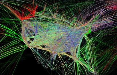 O artista plástico Aaron Koblin se especializou em criar imagens coloridas usando uma matéria-prima incomum: as rotas dos aviões que sobrevoam a América do Norte e partes dos Oceanos Atlântico e Pacífico.