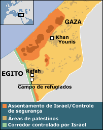 Pelo menos duas pessoas morreram nesta segunda-feira na Faixa de Gaza, depois que um helicóptero israelense disparou mísseis contra o campo de refugiados palestino de Rafah, perto da fronteira com o Egito. O ataque, que também deixou cinco pessoas feridas, ocorreu ao final de um dia de tensão no campo de Rafah, que está cercado de tanques e soldados e isolado do resto da faixa de Gaza. Muitos palestinos passaram a segunda-feira tentando deixar o campo, temendo que os soldados israelenses destruam mais casas, como fizeram na semana passada. Israel iniciou a atual operação em resposta às mortes de cinco soldados em uma explosão perto do campo de Rafah na semana passada. Zona de distensão