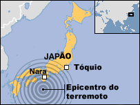 Um terremoto de 6,8 pontos na escala Richter atingiu o oeste do Japão neste domingo. O tremor foi sentido em Tóquio, segundo relatos da agência de notícias AP. Até o momento, não há informações sobre os danos causados. De acordo com a agência meteorológica, o terremoto aconteceu às 19h07 local (7h07 em Brasília). Os tremores mais fortes foram sentidos na cidade de Nara, capital do Japão no século 8, onde existem muitos templos antigos. "Estamos recebendo confirmações das cidades atingidas de que não há estragos, mas ainda há alguns locais para checar", disse um policial na península de Kii à agência de notícias AFP. No entanto, a rede de televisão NHK disse que uma mulher de 89 anos, moradora da cidade de Kyoto, ao norte da península de Kii, ficou ferida após cair durante o tremor. As principais estações de trem foram fechadas até que todas as linhas sejam verificadas. |