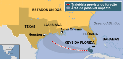 Segundo as previsões, o furacão deve atingir até o fim da semana o Estado do Texas, mas ainda há uma possibilidade de atingir também a região da Louisiana, onde fica Nova Orleans, e o norte do México.