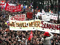 Na cidade de Nantes a polícia afirma que 42 mil participaram do protesto, mais do que o dobro registrado em 18 de março. Le Mans, Rouen e Tours também registraram aumento no número de manifestantes. O governo diz que seu projeto vai encorajar os empregadores a contratarem mais jovens, mas os estudantes temem que ele acabará com a estabilidade trabalhista num país onde mais de 20% dos jovens entre 18 e 25 anos estão desempregados – mais do que o dobro da média nacional. Na França, as manifestações populares são consideradas há muito tempo como uma poderosa arma política. Mas há o temor em ambos os campos sobre uma possível quebra da ordem pública se os protestos continuarem. |