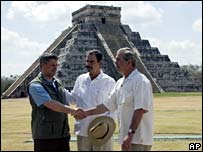 O presidente americano George W. Bush disse que apóia a imigração do México e da América Central para os Estados Unidos desde que seja feita de maneira organizada. Bush fez essa declaração durante conversações com o presidente do México, Vicente fox, no primeiro dia de uma reunião de cúpula em Cancún. O encontro, de dois dias, deverá incluir também o novo primeiro-ministro do Canadá, Stephen Harper. Bush disse que não é favorável ao apressamento do processo de obtenção da cidadania americana por imigrantes ilegais, numa referência a reformas propostas nas leis de imigração dos Estados Unidos. Fox admitiu que o México e os países da América Central têm um papel a desempenhar no combate à imigração ilegal. Há muito busca a legalização do status do que se estima serem seis milhões de mexicanos sem documentos vivendo nos Estados Unidos. Bush, que encontra Harper pela primeira vez desde a posse do canadense, em fevereiro, vai tentar acalmar as preocupações do Canadá com o plano americnao de pedir que os cidadãos do país mostrem seus passaportes ao cruzar a fronteira. Atualmente apenas a carteira de motorista é exigida. Comércio também estará na pauta das conversações, com divergências sobre as tarifas americanas à importação de madeira canadense. O esquema de segurança para a reunião foi reforçado. O governo mexicano isolou boa parte da ilha, impondo, inclusive, um bloqueio naval. |