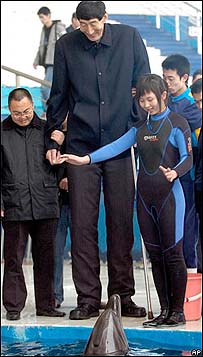 O homem mais alto do mundo salvou dois golfinhos na China usando seus longos braços para tirar sacos plásticos dos estômagos dos animais.