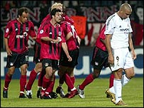 O atacante França venceu o duelo com Ronaldo nesta quarta-feira, ajudando a selar a sorte do Real Madrid na goleada de 3 a 0 aplicada pelo Bayer Leverkusen na Liga dos Campeões. França marcou o segundo gol do Bayer, aos 5 minutos do segundo tempo. Os outros gols foram marcados por Krzynówek, no primeiro tempo, e Berbatov. A zaga brasileira do Bayer, formada por Juan e Roque Júnior - que já atuaram com Ronaldo na Seleção Brasileira - conseguiu anular Ronaldo. A melhor jogada o atacante do Real Madrid foi quando ele acertou a bola no travessão do gol alemão aos 25 minutos do primeiro tempo. Estréia morna Rivaldo, em sua estréia pelo time grego Olympiakos, não conseguiu derrotar o espanhol Deportivo La Coruña, pelo qual já atuou. Rivaldo, porém, ofereceu perigo ao gol adversário em pelo menos duas ocasiões no primeiro tempo. O atacante teve uma boa chance de gol logo ao cinco minutos. Dez minutos depois, um chute de longe do atacante passou perto da trave adversária. O Olympiakos desperdiçou a chance de abrir o marcador quando o goleiro José Molina, do La Coruña, não conseguiu agarrar uma cobrança de falta de Rivaldo. Na seqüência, Gabriel Schurrer chutou longe do gol espanhol. Violência Na Itália, a partida entra Roma e Dynamo Kiev foi interrompida no final do primeiro tempo, quando o juiz Anders Frisk foi atingido por um objeto jogado pela torcida. Antes, ele havia expulsado o zagueiro Philippe Mexes, da Roma, que chegou ao intervalo perdendo por um a zero. Outro brasileiro que marcou na rodada foi Juan, do Lyon. O lance do jogador, depois de cobrança de falta de Juninho Pernambucano, garantiu o empate da equipe francesa com o Manchester United: 2 a 2. Resultados da rodada Liverpool 2 x 0 Monaco |
