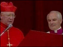 Joseph Ratzinger é anunciado como novo papa pelo cardeal chileno Jorge Arturo Medina Estivez para uma multidão na praça São Pedro, no Vaticano.