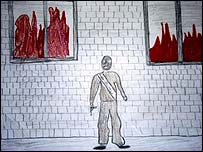 Outra sobrevivente do cerco é a garota Laima, de nove anos de idade. Ela me mostra o desenho de um terrorista com o rosto coberto por uma máscara.