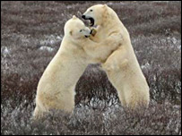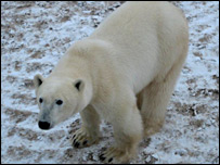 Enquanto esperam a água congelar, diz ela, os ursos normalmente alternam momentos de sono com momentos em que lutam para brincar. Após o longo jejum do verão, os animais não têm muita energia, e estão famintos. Segundo Waterman, enquanto não podem caçar, os ursos sobrevivem comendo algas, mas é só um aperitivo. Eles precisam comer logo. "Tundra Buggy" Nós atravessamos a lama e o gelo às margens da Baía em um veículo chamado "Tundra Buggy". É um veículo imenso, como se fosse algum tipo de meio de transporte de exploração lunar, e serve não apenas para atravessar com segurança a superfície irregular e escorregadia, mas também para proteger os cientistas dos ursos. Os animais parecem saudáveis e há pouco que indique que o longo jejum esteja tendo algum efeito sobre eles neste ano. Mais isso é resultado de uma boa temporada de caça antes da primavera passada.