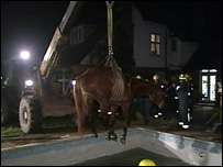 Uma égua que fugiu de um estábulo em Hampshire, na Inglaterra, foi salva por bombeiros depois de haver caído na piscina de um vizinho.