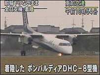 O canal de televisão estatal NHK, do Japão, transmitiu ao vivo o pouso de emergência de um avião da companhia aérea All Nippon Airways, com 60 pessoas a bordo. A aeronave teve problemas com o trem de pouso dianteiro e circulou no ar por quase duas horas até aterrissar no aeroporto de Kochi com o bico deslizando na pista. O Ministério do Transporte japonês informou que nenhum passageiro ficou ferido. O avião Bombardier DHC-8, que transportava 56 passageiros e quatro tripulantes, vinha de Osaka.