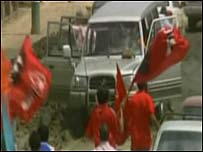 Manifestantes partidários do presidente equatoriano, Rafael Correa, atacaram o carro de deputados da oposição. Os parlamentares são contra um referendo que propõe a formação de uma Assembléia Constituinte. Os deputados tiveram que entrar em um veículo blindado da polícia para escapar do tumulto. |