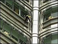 Alain Robert, conhecido como o 'homem-aranha' francês, já escalou 65 prédios em diferentes países, inclusive o da Fiesp, em São Paulo. Na mais sua recente aventura, ele escalou, sem nenhum equipamento de segurança, 60 andares de uma das torres gêmeas Petronas, em Kuala Lumpur, na Malásia. O francês só não continuou escalando até o 88º e último andar da torre porque foi pego por bombeiros e levado à delegacia, onde passou a noite. A torre - que Robert tentava escalar pela segunda vez - tem quase 1,5 mil metros de altura. |