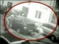 As imagens mostram o motorista saindo de seu carro, aparentemente exasperado, supostamente, com a lentidão de pedestres que passavam à sua frente.
