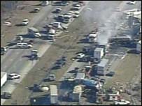 Imagens de vídeo mostram os destroços de dezenas de carros e caminhões queimados, e equipes de emergência atendendo feridos.