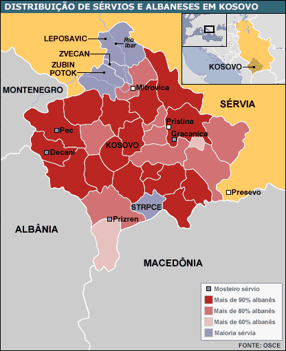 O presidente russo Vladimir Putin afirmou nesta quinta-feira que seria ilegal e imoral a comunidade internacional reconhecer uma eventual declaração de independência da província. O governo sérvio também já deixou claro que não aceitará uma eventual declaração de independência pelas lideranças albanesas da província. A BBC compilou uma série de perguntas para ajudar você a entender as principais questões em jogo. Qual é o atual status de Kosovo? Apesar de ser formalmente uma Província da Sérvia, Kosovo é administrado pela Organização das Nações Unidas (ONU) desde 1999. Mas tem seu próprio governo e Parlamento. A ONU assumiu o poder depois que uma ofensiva da Organização do Tratado do Atlântico Norte (Otan) forçou a saída de tropas sérvias, que eram acusadas de perseguir a população albanesa, majoritária em Kosovo. Na época, o governo sérvio alegou que suas forças estavam respondendo a um levante de separatistas albaneses armados. Por que não se chegou a um acordo? Os líderes albaneses de Kosovo dizem que não aceitam nada menos do que a independência total. Mas a Sérvia responde que quer oferecer apenas autonomia. O que a ONU propôs? Em abril, o enviado especial da ONU, Martti Ahtisaari, apresentou um plano que oferecia a Kosovo uma "independência supervisionada". Segundo o plano, agências internacionais levariam gradualmente Kosovo à independência completa e à entrada na ONU. Isso evitaria que Kosovo se anexasse à Albânia ou tivesse suas regiões de predominância sérvia separadas para se tornarem parte da Sérvia. Algum país se opõe ao plano de Ahtisaari? A Sérvia e a Rússia são os principais opositores. A Sérvia rejeita a declaração de independência afirmando que é "um ato de separação evidente e unilateral, de uma parte do território da República da Sérvia e... então sem validade". O presidente russo Vladimir Putin já deixou claro que o reconhecimento de uma declaração unilateral de independência "seria imoral e ilegal". A Rússia é, tradicionalmente, uma aliada da Sérvia e teme uma expansão da União Européia na região dos Bálcãs. O bloco ofereceu, recentemente, um acordo interino a Belgrado, o que abriria caminho para a integração à União Européia. Bósnia-Herzegovina e Montenegro também são contra. Quando Kosovo deve declarar sua independência? Ainda não foi estabelecida uma data, mas espera-se que a independência seja proclamada no dia 17 de fevereiro, depois de uma sessão especial no Parlamento de Kosovo. Os Estados Unidos e a maioria dos membros da União Européia são favoráveis à independência e devem reconhecer o Kosovo como país independente quase imediatamente. O plano de Ahtisaari prevê um período transitório de 120 dias após a declaração de independência, durante o qual se adotaria uma nova Constituição e medidas para garantir os direitos da minoria sérvia. A independência de Kosovo seria efetivada depois desse período transitório. Se Kosovo declarar independência, o que vai acontecer com a minoria sérvia? Os sérvios são predominantes em Kosovo no norte do território, na região do Rio Ibar. Estima-se que 120 mil pessoas façam parte desta minoria.