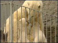 Pela primeira vez desde que nasceram, os filhotes gêmeos de uma ursa polar do Zoológico de Schoenbrun, em Viena, na Áustria,