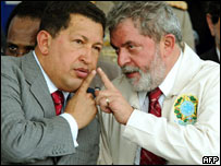 Para o sociólogo venezuelano Javier Biardeau, o presidente Luiz Inácio Lula da Silva tem mais peso quando as soluções de conflitos são levadas a instituições multilaterais, como a OEA (Organização dos Estados Americanos). “Chávez limita-se a replicar a política dos Países Não-Alinhados, já Lula tem mais flexibilidade e diversidade de aliados. Na hora da verdade, quem bate o martelo é sempre o Brasil”, acredita Biardeau. Teodoro Petkoff, ex-ministro do governo de Rafael Caldera nos anos 1990 e opositor a Chávez, concorda. “Chávez não ameaça o Brasil. Existe uma paranóia americana que superdimensiona o seu governo.” Diplomacia do dinheiro Para observadores, os dois presidentes e suas diplomacias têm estratégias distintas quando o assunto é integração e liderança regionais. “Ambos desenvolvem estratégias diferentes, que avançam paralelamente, mas não são antagônicas. Nos projetos de integração, Chávez enfatiza o fator político, e Lula, a consolidação econômica ”, avalia Javier Biardeau. Apesar disso, é justamente a Venezuela que tem tido dinheiro para tocar projetos econômicos e fazer um papel que alguns países vêem como naturalmente brasileiro. A Venezuela é o quinto maior exportador mundial de petróleo cru e vive a bonança do aumento dos preços do barril (acima dos US$ 100), que permitiu ao país um crescimento econômico de 8,4% no ano passado. “Chávez assume uma liderança no campo energético que lhe permite realizar esquemas de cooperação petrolífera privilegiados”, afirma o analista internacional Carlos Romero. O dinheiro das receitas com petróleo também permite que a Venezuela lidere a proposta de criação de um banco de desenvolvimento regional, o Banco do Sul, ou ajude a Argentina comprando títulos da dívida do país – Chávez prometeu comprar US$ 1 bilhão apenas no ano passado. Além disso, com uma economia extremamente concentrada na produção de petróleo - o país é um grande importador de outras mercadorias -, a Venezuela se apresenta como uma alternativa menos desigual comercialmente, afirma Biardeau. “Países economicamente menores agora preferem não tomar o trem brasileiro porque o padrão de desigualdade e assimetrias com o Brasil não lhes convém”, avalia. Em contraste, o Brasil tem sido pressionado por vizinhos menores a criar mecanismos para ajudar ou compensar assimetrias econômicas regionais ou ajudar parceiros menores. Mas os resultados têm sido tímidos.
