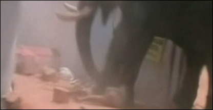 As imagens da televisão indiana mostram um elefante macho adulto invadindo a área do templo e derrubando um telhado de palha, antes de forçar a passagem através de um portão de aço e pisotear um homem.