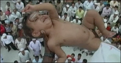 Os devotos acreditam que a prática de jogar os bebês da torre para um pano branco esticado fortalece as crianças, mas muitos
