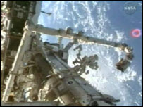O laboratório é tão grande que não sobrou espaço na Discovery para a haste de inspeção, um braço robótico de 15 metros de comprimento, que permite a inspeção de eventuais danos nas asas e no bico da nave por meio de câmeras e sensores. O instrumento foi incluído no equipamento de segurança pela Nasa depois do acidente com o ônibus espacial Columbia, em 2003, causado por um estrago após o impacto da nave com destroços. A última equipe a visitar a EEI deixou a haste de inspeção armazenada temporariamente na parte externa da estação, para que os astronautas da Discovery a usassem e depois levassem o instrumento de volta para a Terra. |