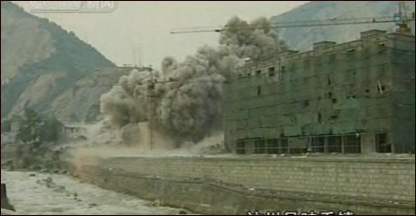 Violentas explosões sacodiram a cidade de Yingxiu, o epicentro do tremor, para destruir prédios condenados pela Defesa Civil.