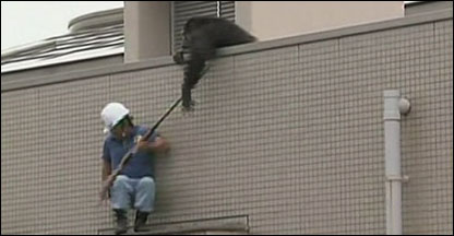 Chegaram até a disparar dardos tranqüilizantes e jatos d'água contra o chimpanzé, mas nada funcionou. O macaco chegou a tomar a arma de um dos tratadores, mas por sorte ela caiu no chão antes que ele pudesse causar mais estragos. A solução para finalmente acalmar o chimpanzé foi a mais óbvia: uma simples banana. Ao aceitar a isca, o animal acabou sendo dominado e levado de volta à jaula. O problema todo começou depois que um dos tratadores esqueceu de trancar uma porta, permitindo a fuga de Ichiro. A temperatura em Ishikawa passou dos 34 graus na terça-feira. |