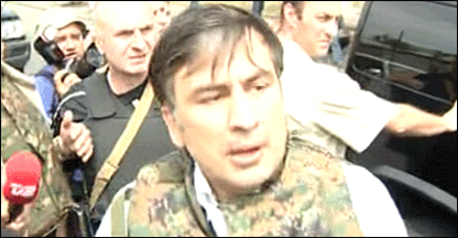 Durante sua visita à cidade de Gori, o presidente da Geórgia, Mikhail Saakashvili, teve que ser retirado do locar às pressas
