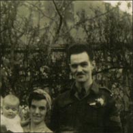 Eileen's father is the tall soldier in uniform on the far right of the picture, her mother is in front wearing a headscarf and holding Eileen. The picture was taken at the wedding of Harold Waddell when he was staioned in Knaphill with Eileen's father |