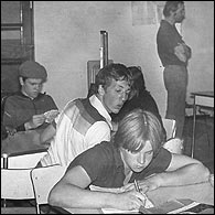 Andy (in flat cap) takes time out to play cards. Another pupil swots in the foreground |