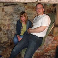 1/4 Sue in the cellar of a pub in Knaresborough with the pub landlord |