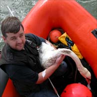 Trevor with a swan rescued from Newhaven Harbour after a fuel leak |
