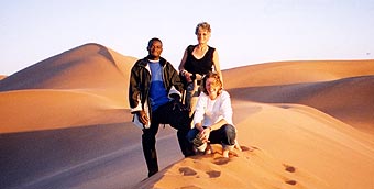 Sue Armstrong (centre) and staff from the Gobabeb Research Station in the sand dunes behind the station. |