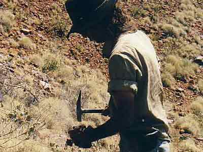 | This is the oldest surviving area of continent in the world, in Australia (3.5 billion years old). Roger Buick (now prof of Astrobiology in Seattle) is a leading expert in the area. He's chipping a piece of rock to look for grains of sand and foolsgold from a solified piece of the world's oldest beach. |