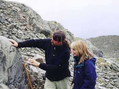 | The rock they're looking at contains the oldest traces of life (c. 3.8 billion years ago) (prog 3). They were discovered by Minik Rosing, a native Greenlander based at the Danish Geological Museum. |