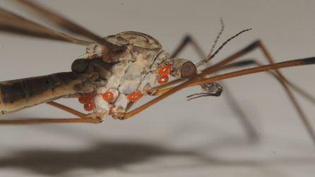 Llau yw'r lympiau bach cochion sydd ar ei frest ac yn ei geseiliau blaen. Ond nid bwydo arno mae y rhain - dim ond bachu 'pas' (neu 'liffd') i ryw borfa frasach. Mae popeth o ddefnydd i rywun, welwch chi !