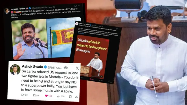 ඇමෙරිකානු දේශපාලන විචාරකයෙකු සහ සමාජ මාධ්ය බලපෑම්කරුවෙකු ලෙස කටයුතු කරන ජැක්සන් හින්කල් සිය X ගිණුමේ සටහනක් තබමින් කියා තිබුණේ, ශ්රී ලංකාවේ කොමියුනිස්ට් ආණ්ඩුව ඇමෙරිකානු හමුදා ගුවන් යානා දෙකකට සිවිල් ගුවන් තොටුපොළට ගොඩබෑමට අවසර දීම ප්රතික්ෂේප කර ඇති බව ය.