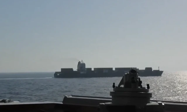 பின்னர், கடற்படை கப்பல் சரக்குக் கப்பலை இடைமறிப்பதாக கூறும் காணொளி ஒன்றை அமெரிக்க ராணுவத்தின் மத்திய கட்டளை மையம் வெளியிட்டது. அதில், சரக்குக் கப்பலை நோக்கி சுடுவதை பார்க்க முடிகிறது.