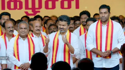 அதற்கு முன்பாக மேடையில் பேசிய விஜய், "தமிழ்நாட்டில் நான்கு முனை போட்டி எல்லாம் இல்லை, இந்த தேர்தலில் இருமுனை போட்டி தான். மக்கள் கூட்டணியான நமக்கும், ஸ்டாலின் சார் கூட்டணிக்கும் தான் போட்டி. திமுகவுக்கு தவெகவுக்கும் தான் போட்டி." என்றார்