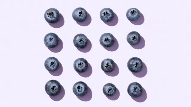 Açık mor bir arka plan üzerinde kare şeklinde dizilmiş yaban mersinleri