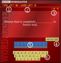 Yerlerinize, hazır, başla! Karşınıza çıkan ekranda bilmeniz gereken bazı özellikler var. Kalan sürenizi (1) , kaç denem daha yapabileceğinizi (2) ve kaçıncı soruda olduğunuzu (3) tüm oyun boyunca görmeniz mümkün. Size sorulan sorunun yanıtını bilmiyorsanız, ya da emin değilseniz ipuçlarından (4)yararlanabilirsiniz. Ama unutmayın alacağınız her yardım sürenizin azalmasına neden olacaktır. Bulmanız gereken kelimeler, sorunun altında mavi kutular (5) olarak gösterilmiştir. Bilgisayarınızın faresini kullanarak, klavyedeki (6) harflerin üzerine tıklayarak yanıtınızı vermelisiniz. Arzu ederseniz bilgisayarınızın klavyesini de kullanabilirsiniz.