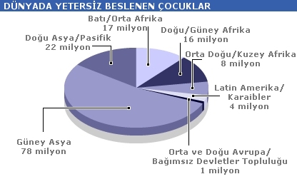 UNICEF'e göre, beş yaşın altında ve normal kiloya sahip olmayan çocukların sayısı, azaltılması yönünde hedefler konmuş olmasına rağmen, 1990 yılından bu yana değişmedi. UNICEF'in raporuna göre, yetersiz beslenen çocukların yarısı, Güney Asya'da yaşıyor. Yetersiz beslenme yüzünden her yıl yaklaşık 5 milyon 600 bin çocuk hayatını kaybediyor. Bu rakam, her yıl meydana gelen çocuk ölümlerinin yarısından fazlası. Birleşmiş Milletler'in koyduğu binyıl hedeflerinden biri de yoksulluk ve açlığı 2015'te sona erdirmekti. Bu, ancak yaşına göre yetersiz kilodaki çocukların sayısını yarı yarıya azaltmakla mümkün olabilir. Ancak UNICEF uluslararası toplumun bu hedefe ulaşılması için gereken yolda olmadığı uyarısında bulundu. Kalkınmakta olan ülkelerdeki çocukların yüzde 27'si, yani yaklaşık 146 milyon çocuk yetersiz besleniyor. 1990 yılında bu oran yüzde 32'ydi. Gıda takviyesi Güney Asya'da, Bangladeş, Hindistan ve Pakistan'da, yaşına göre yetersiz kilodaki çocuklar, toplam rakamın yarısını oluşturuyor. Hindistan'da beş yaşın altındaki çocukların yüzde 47'si normal kilonun altında. Sıklıkla kıtlık yaşanan Doğu ve Güney Afrika'da da çok az ilerleme kaydedilmiş durumda; çocukların yüzde 29'u yetersiz besleniyor. Doğu Asya'da Çin, 1990 yılından bu yana normal kilonun altındaki çocukların oranını yüzde 6,7 düşürdü, ancak bölgedeki diğer ülkeler bunun çok gerisinde. Dünyada sadece iki bölgede, Latin Amerika ve Karayipler'de çocukların yüzde 7'si normal kilonun altında. Çocukların yüzde 15'inin etkilendiği Doğu Asya ve Pasifik'te ise binyıl hedeflerine ulaşılması bekleniyor. Orta ve Doğu Avrupa ile Sovyetler Birliği'nin dağılmasından sonra kurulan ülkelerde ise normal kilonun altındaki çocukların oranı yüzde 5'i geçmiyor. Vitamin ve mineraller Çocukların gelişiminde vitamin ve minerallerin büyük yeri var, bunların eksikliği ise çeşitli hastalıkları beraberinde getiriyor. Örneğin, iyot eksikliği her yıl yaklaşık 37 milyon yeni doğanda öğrenme güçlüğüne neden oluyor. UNICEF de, A vitamini sağlanması ve gıdalardaki demir ile iyot içeriğinin artırılması gibi bir dizi uygulama çağrısında bulunuyor. UNICEF'e göre, çocuk beslenmesi ulusal politikaların da merkezinde yer almalı.