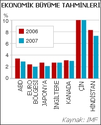 Buna karşılık IMF, bu yıl ve gelecek yılki büyüme oranı tahminlerini yükseltti. IMF, Türkiye'yle ilgili olaraksa bu yıl enflasyonun yüzde 10,2, büyümeninse yüzde 5 olacağını söylüyor. Bu rakamlar IMF ve Dünya Bankası'nın Singapur'daki yıllık toplantıları öncesinde yayımlanan Dünya Ekonomik Görünümü raporunda yer aldı. IMF, nisan ayında 4,9 olarak tahmin ettiği dünya ekonomisinin bu yılki büyüme oranını 5,1'e, gelecek yılki oranıysa yüzde 4,7'den yüzde 4,9'a yükseltti. Rapora göre bu olumlu gelişmeye rağmen ekonomik buhran riskinin varolmasının en büyük nedenleri petrol fiyatlarının yüksekliği, ABD'nin bütçe açığı ve Çin'in dev ticaret fazlasından doğan dengesizlikler.