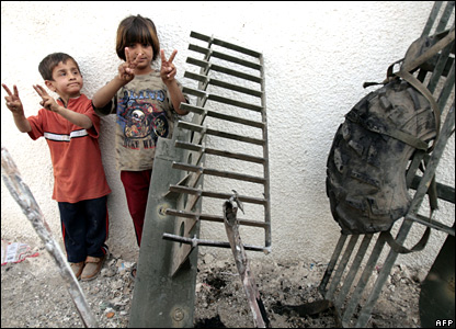 Sadr mahallesinde yol kenarına yerleştirilen bir bombayla vurulan Amerikan askeri aracının enkazı başında zafer işareti yapan çocuklar.