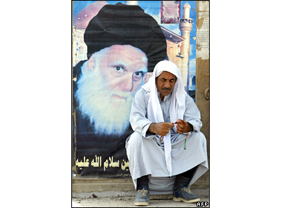 Bağdat'ta 1999'da öldürülen, Mukteda es-Sadr'ın babasının posteri önünde tesbih çeken bir Iraklı. |
