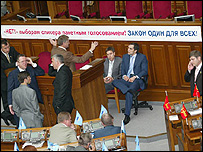 За словами лідера Нашої України Романа Безсмертного, коаліція не ухвалювала жодного рішення, яке б порушувало Конституцію і виступає проти мови ультиматумів. Лідерка БЮТ Юлія Тимошенко заявила, що блокування парламенту негативно позначилось на політичному та економічному житті країни. Олександр Мороз запропонував, щоб круглий стіл відбувся за участі журналістів. Він також сказав, що опозиція має боротися за свої права конституційними методами. Один з лідерів БЮТ Олександр Турчинов заявив, що наступного тижня більшість за будь-яких обставин обере спікера і прем'єра. Він наголосив, що для демократичної коаліції не є принциповою технологія і форма голосування по керівництву Верховної Ради та уряду. Раніше представники коаліції наполягали на пакетному голосуванні за прем’єра та спікера. | Також на цю тему Ющенко закликав парламентарів до переговорів 29 червня, 2006 | УКРАЇНА Регіони: пакетне голосування - неконституційне27 червня 2006 | ДОКЛАДНО Преса 27 червня: Футбольні та коаліційні пристрасті27 червня 2006 | ПРЕСА Випробування коаліції26 червня, 2006 | УКРАЇНА Преса 22 червня: нудить від коаліції22 червня 2006 | ПРЕСА Коаліція готова формувати уряд22 червня, 2006 | УКРАЇНА Наша Україна на двоє ворожила...19 червня, 2006 | УКРАЇНА Мороз: я готовий відмовитися від посади голови ВР14 червня, 2006 | УКРАЇНА | ||||||||||||||||||||||||||||||||||||||||||||||||||||||||||||||||||||||||||||||||||